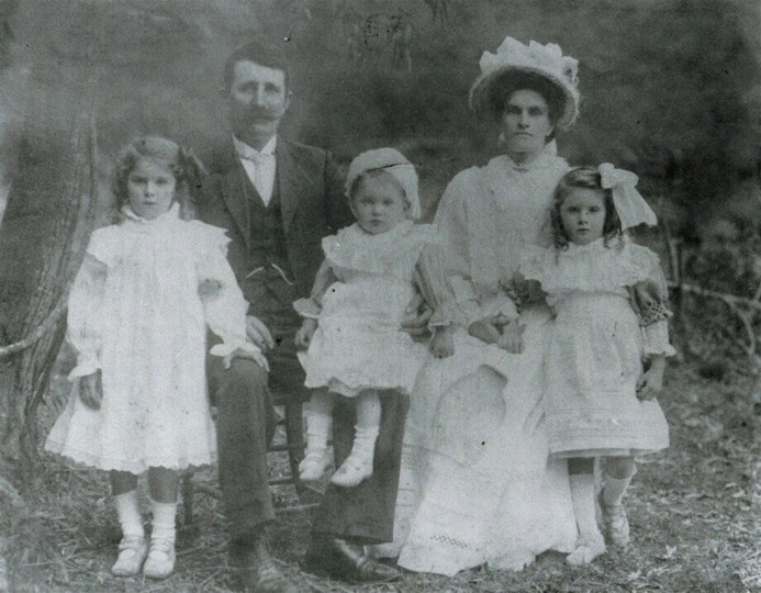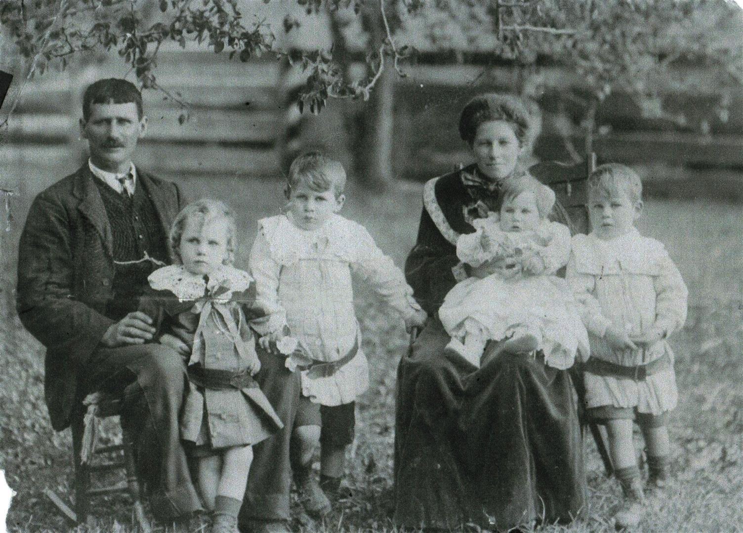 | Carting hay at Pericoe. c.1900 Man in white suit is Percy Alexander, on his left (in middle) is his brother Robert Alexander (known as Beau) and the others are believed to be other brothers, Syd, Alf and Horace (known as Eden). (Names courtesy of Kathy Jones) |