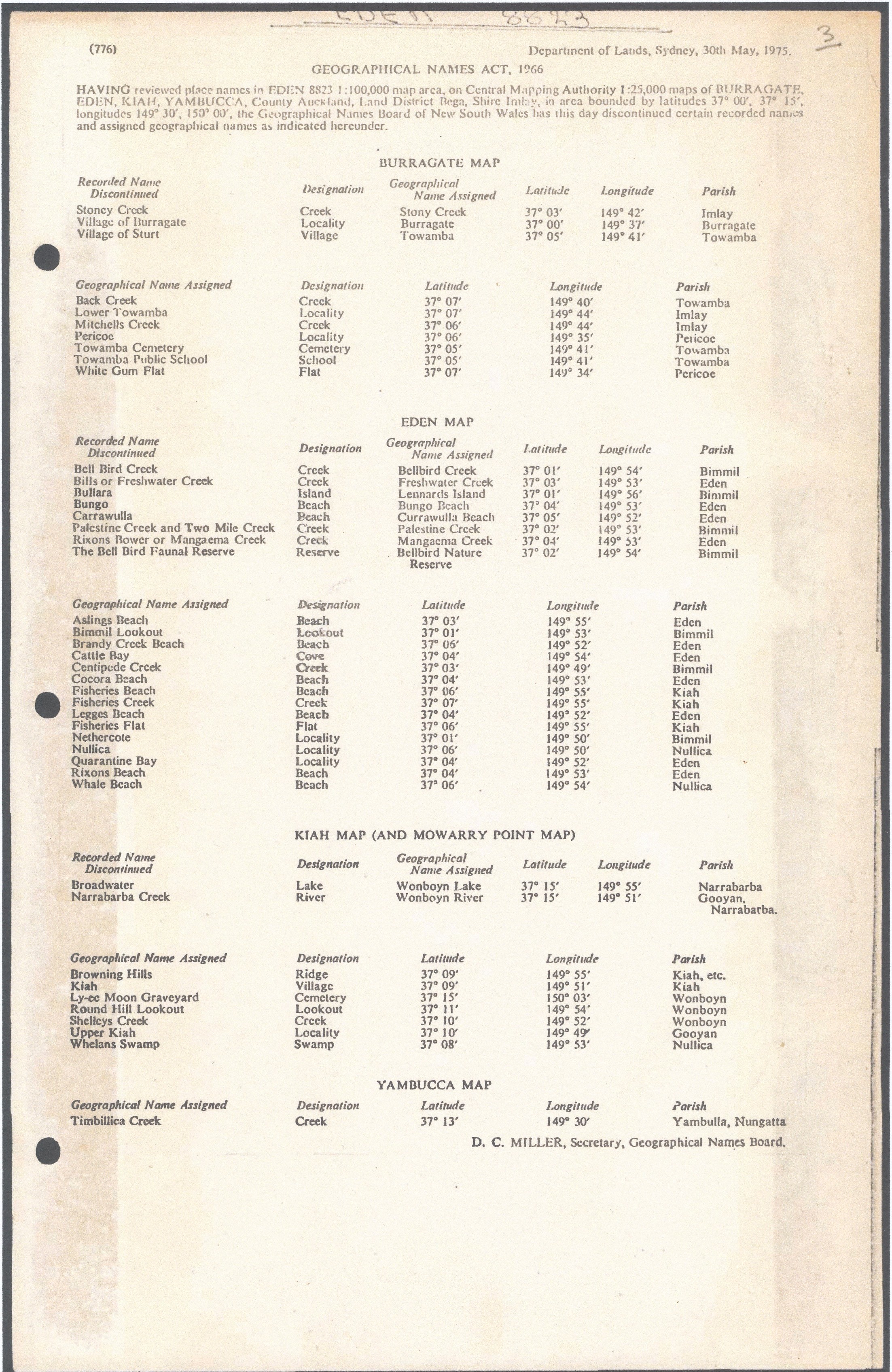 As a result the name 'Village of Sturt' was discontinued on 30 May 1975 and the name Towamba subsequently assigned. See attached gazette notice. Geographical Names Board