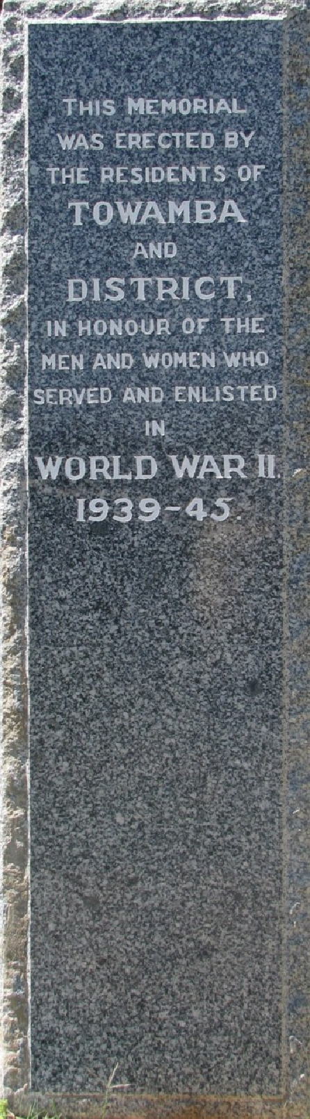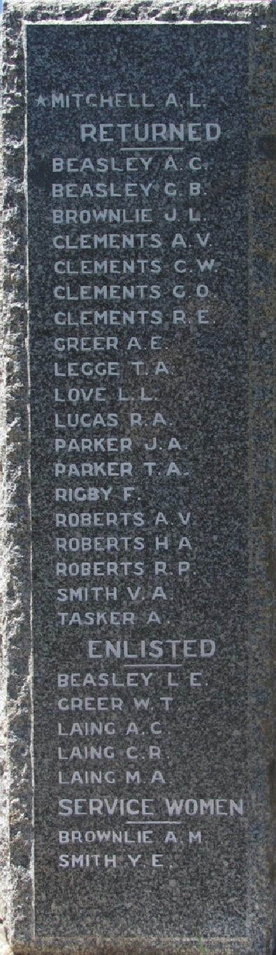 Front Bottom Plaque 1939-1945 [THEY GAVE THEIR LIVES] FARRELL A. R. ROBERTSON K. ROBINSON W.R. SAWERS A. G. Right Hand Side Plaque THESE ALSO SERVED AMEY, J.A. DIVERSI, J. FARRELL, C. FARRELL, J. D. GRANT, D. M. GRANT, P. F. GRANT, W. J. GRANT, W. P. LINWALL, F. MOORE, E. R. PHEENEY, W. R. |
