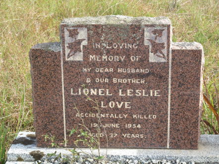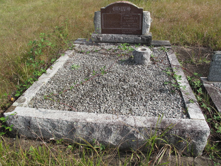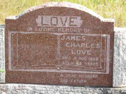 LOVE In Loving Memory Of JAMES CHARLES LOVE Died 4. Aug. 1958 Aged 45 Years. A Dear Husband And Father. (left side blank) |