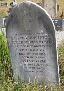 The Beloved Sons Of R. H. & M. A. JOHNSTON FREDRICK THOMAS WESTERN Died 25th Dec. 1897, Aged 10Years TOM PRUSS Died 3rd Dec. 1913 Aged 18 Years SYLVESTER, Died 20th Feb. 1890 Aged 10 Days Rest In Peace |
