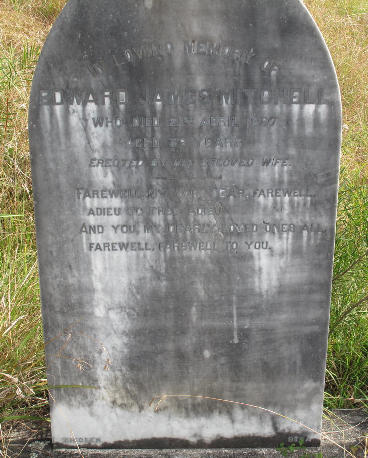 In Loving Memory Of EDWARD JAMES MITCHELL Who Died 21st April 1897 Aged 39 Years Erected By His Beloved Wife Farewell, My Wife Dear, Farewell, Adieu To Thee, Adieu! And You, My Dearly Loved Ones All Farewell, Farewell To You. |