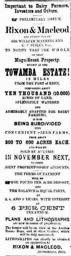 The place-name Towamba is an interesting one. If it is Aboriginal, I can find no word that gives a meaning or matches the pronounciation. Some of the elderly residents of Towamba, when interviewed, pronounced it as 'Toowamba'. A copy of one old map which unfortunately has been lost, had the word 'Tuam' at the head of, what is now called, the Towamba River. Further investigation was fruitless. Much later I put the word 'Tuam' into Google and it came up with the place-name Tuam as being in Scotland.